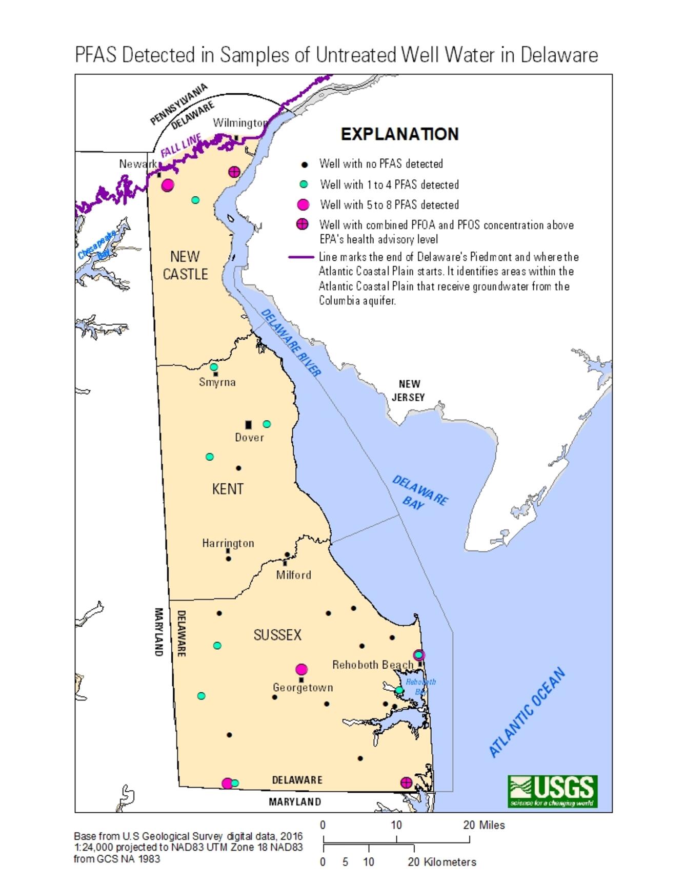 The wells sampled by the USGS all receive groundwater from the Columbia aquifer, which supplies water for more than 90% of the state. The researchers found a variety of types of PFAS in water from 16 of the 30 wells sampled in Delaware; one sample contained eight different types. Those that contained PFAS generally had low concentrations.